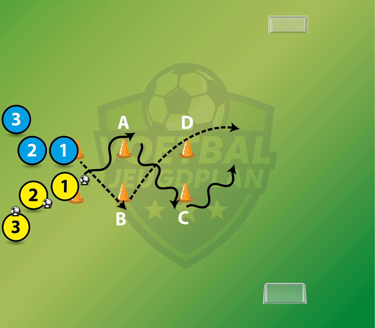 Partijspel 3 tegen 3 op 4 doeltjes - op ieder doeltje scoren